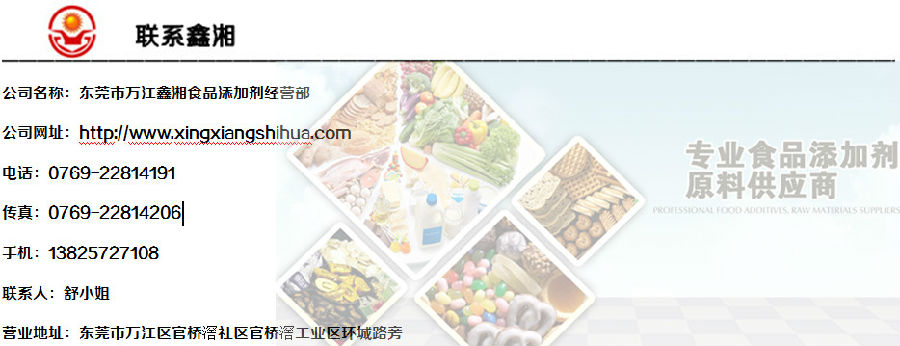 東莞市萬江鑫湘食品添加劑經營部經營進口和國產食品添加劑、食品原料輔料和香精香料,業務范圍覆蓋了食品、飼料、日化以及電鍍等多個行業,公司秉持提供優質服務,優惠價格,以客戶需求為己任的一貫宗旨,不斷向產品優質化、客戶精細化、市場專業化的方向邁進。公司將熱誠歡迎各界前來參觀、考察、洽談業務。