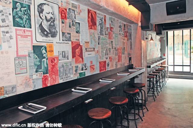 意大利人在周末總是安排了家庭聚會,自家炮制一兩道家常菜互相探訪;即使平日也喜歡與友人聚在一起,在露天小店飲兩杯,來幾客佐酒小吃,談天說笑,悠閑地度過一個下午。位于九如坊的“Risi E Bisi”,露出不太修飾的紅磚墻身,擺放了充滿金屬味道的懷舊椅子,又以意大利仿古報紙當墻紙,就是想打造一個與好友輕松吃喝的聚腳點。