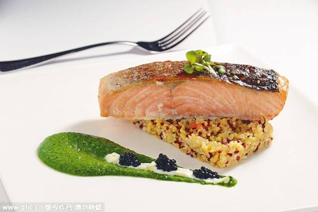 鮭魚外脆內嫩,伴魚子醬檸檬忌廉蔬菜汁以提鮮。