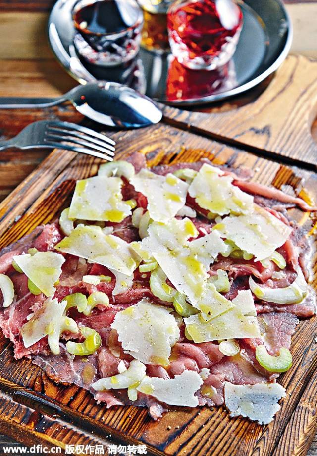 牛肉片以檸檬汁、橄欖油、鹽及胡椒調味,味道鮮香。