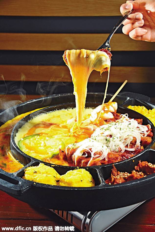 當中最受歡迎的,要數芝士肋骨,鐵板上放滿了Mozarella芝士和車打芝士,以及用韓國辣醬煮成豬肋骨,開啟煤氣爐后,芝士很快溶掉,這時候便要把蘸滿芝士醬的豬肋骨夾起來,立刻大口咬下去,豬肋肉入口松化,又帶芝士香味。雖然豬肋骨以韓式辣醬煮成,但入口不算辛辣,不嗜辣的人也能接受。