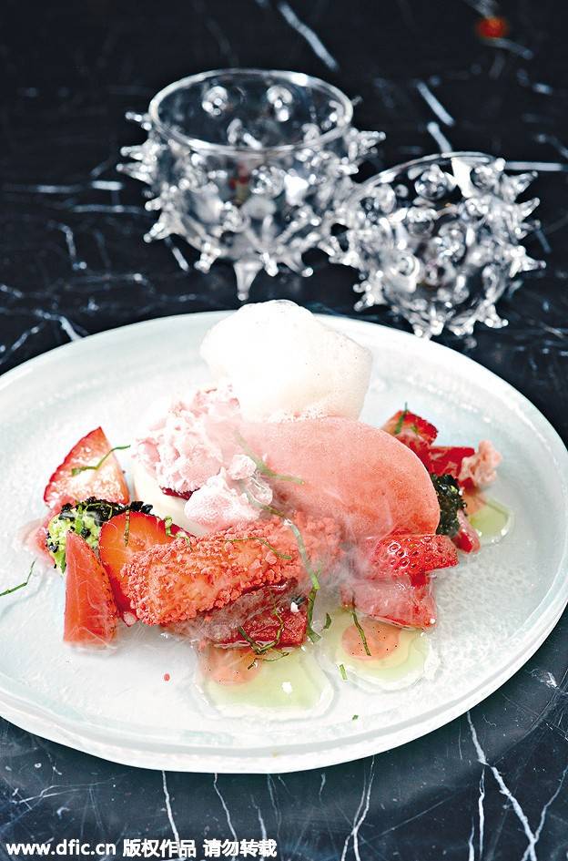由英國名廚Tom設計的新菜單,充分展現他的創意和烹調天分。如嫩煮五花腩,便用上歐洲流行的烹調手法“Brined”,將豬肉放入已調味的水內,置于雪柜浸泡過夜,待豬肉入味后慢煮十二小時,此法能令肉類的味道、質感更佳。最后配以雪利醋、蜜糖調成醬汁,味道酸甜,正好中和五花腩膩滯感。甜品檸檬葉及羅勒奶凍伴草苺多重奏,用上十五種方法炮制甜品,例如將草苺造成不同形態,例如氮氣、慕絲、雪葩及啫喱等。