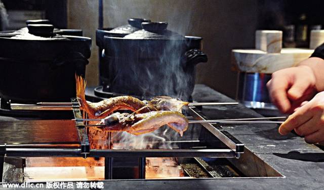師傅一邊以土鍋炊米,一邊制作鹽燒赤鯥(HK$268半條)