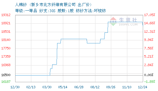 12月24日新鄉市北方纖維有限公司關于人棉紗的報價為19000元/噸。人棉紗的出產地為河南;倉儲地為河南省;人棉紗的屬性:等級:一等品;紗支:30S;股數:1股;紡紗方法:環錠紡。該報價有效期為7天。