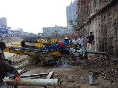LD-100系列履帶式多功能全液壓鉆機主要特點:1.該系列鉆機采用臺灣進口HB-500沖擊、旋轉一體式動力頭,該動力頭采用高扭矩旋轉馬達,旋轉動力更強,扭矩可達15000N·m,液壓沖擊性能更優異,沖擊力可達750~800N·m,適合各種復雜地層施工。2.適應各種鉆進工藝,能有效解決在松散覆蓋地層、回填地層、卵礫石層、破碎層以及淤泥和砂層中鉆進的成孔困難問題。在復雜地層可進行(鉆桿+套管)雙管齊下沖擊回旋鉆進,有效地防止孔內坍塌,方便裝置錨具等其他相及配件以及注漿。特有的套管鉆進工藝可快速進行管棚鉆孔作業,完成除險加固工程。